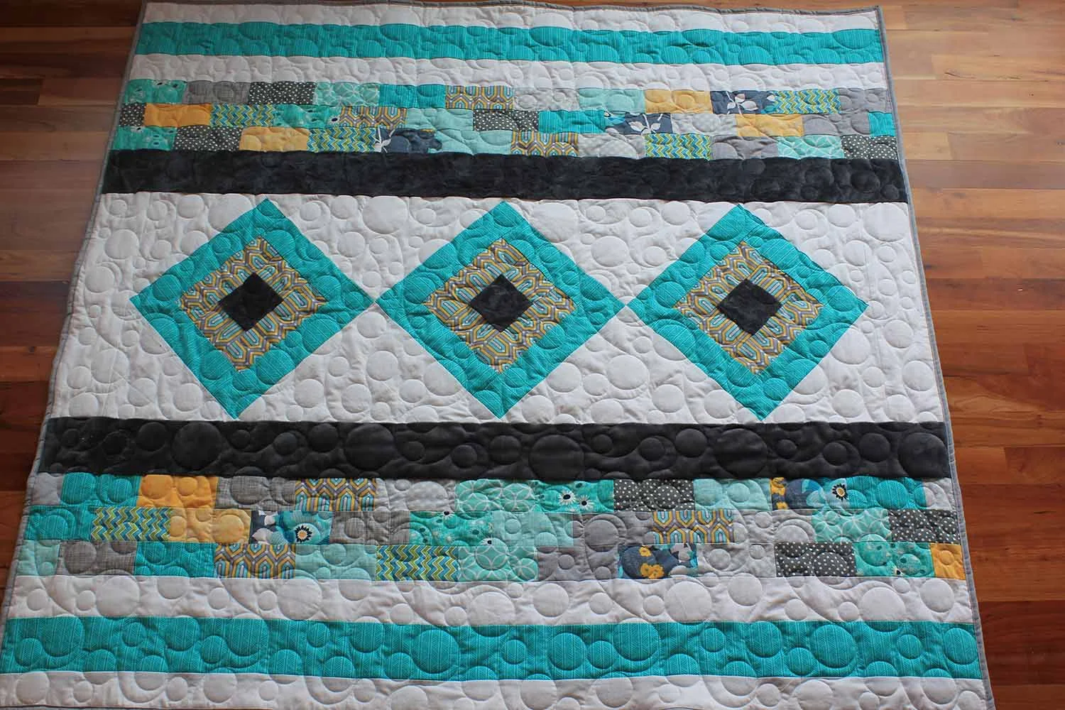 Spring is here! For my first-ever blog post, I am sharing something MODERN and bright. This quilt has teal, a small bit of yellow and includes texture on the quilt top by using gray minky.